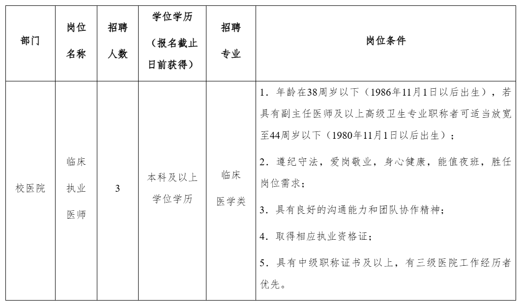 為加強學校醫(yī)療隊伍建設(shè),經(jīng)研究,決定面向社會公開招聘醫(yī)務(wù)工作人員3名。現(xiàn)將有關(guān)招聘事項通告如下: