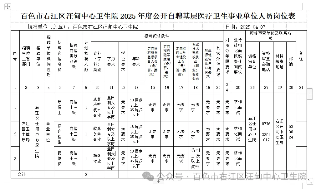 附:右江區(qū)汪甸中心衛(wèi)生院2025年度公開自聘基層醫(yī)療衛(wèi)生事業(yè)單位人員崗位表
