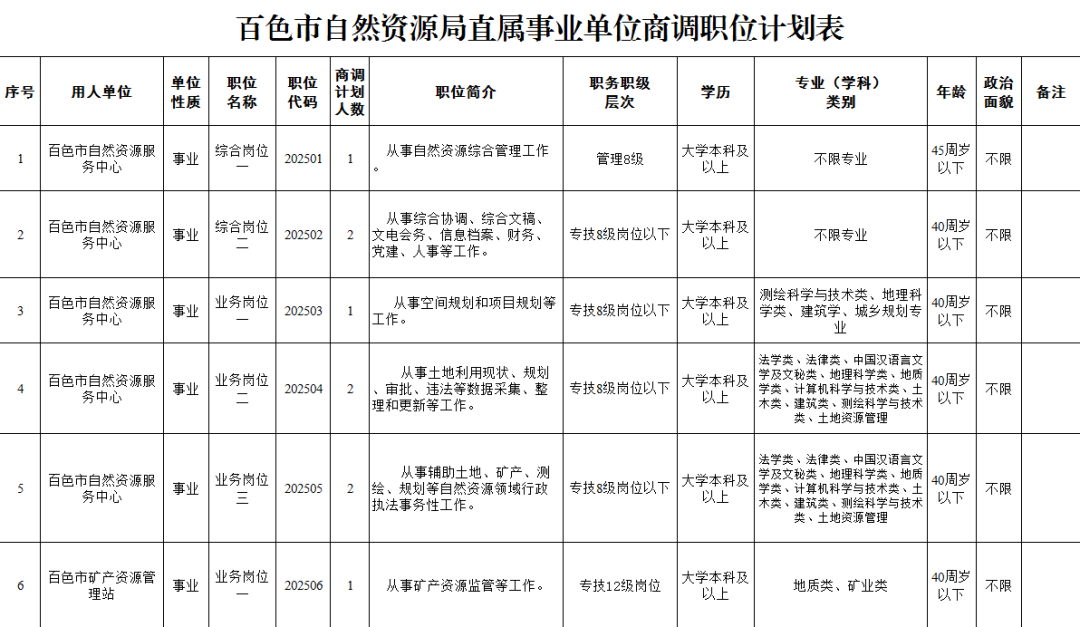 商調(diào)職位為百色市自然資源服務(wù)中心和百色市礦產(chǎn)資源管理站。具體職位信息詳見《百色市自然資源局直屬事業(yè)單位商調(diào)職位計(jì)劃表》。