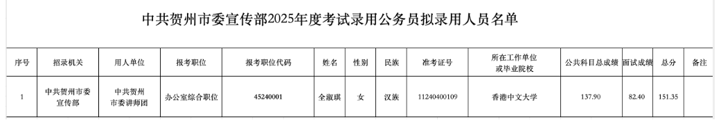 根據(jù)《廣西壯族自治區(qū)2025年度考試錄用公務(wù)員公告》要求,經(jīng)過公開報(bào)名、資格審查、筆試、面試、體檢、考察等程序,確定全淑琪1名同志為擬錄用公務(wù)員,現(xiàn)予以公示。公示期為2025年6月6日至6月12日(5個(gè)工作日)。如對擬錄用人員有異議,請?jiān)诠酒趦?nèi)向中共賀州市委宣傳部實(shí)名反映。