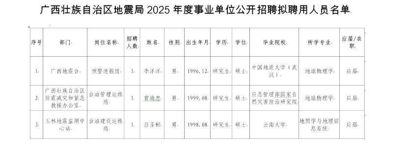 廣西壯族自治區(qū)地震局2025年度事業(yè)單位公開(kāi)招聘擬聘用人員公示