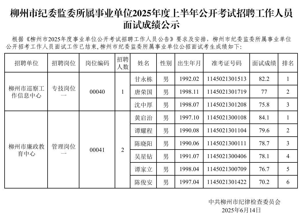柳州市紀委監(jiān)委所屬事業(yè)單位2025年度上半年公開考試招聘工作人員面試成績公示