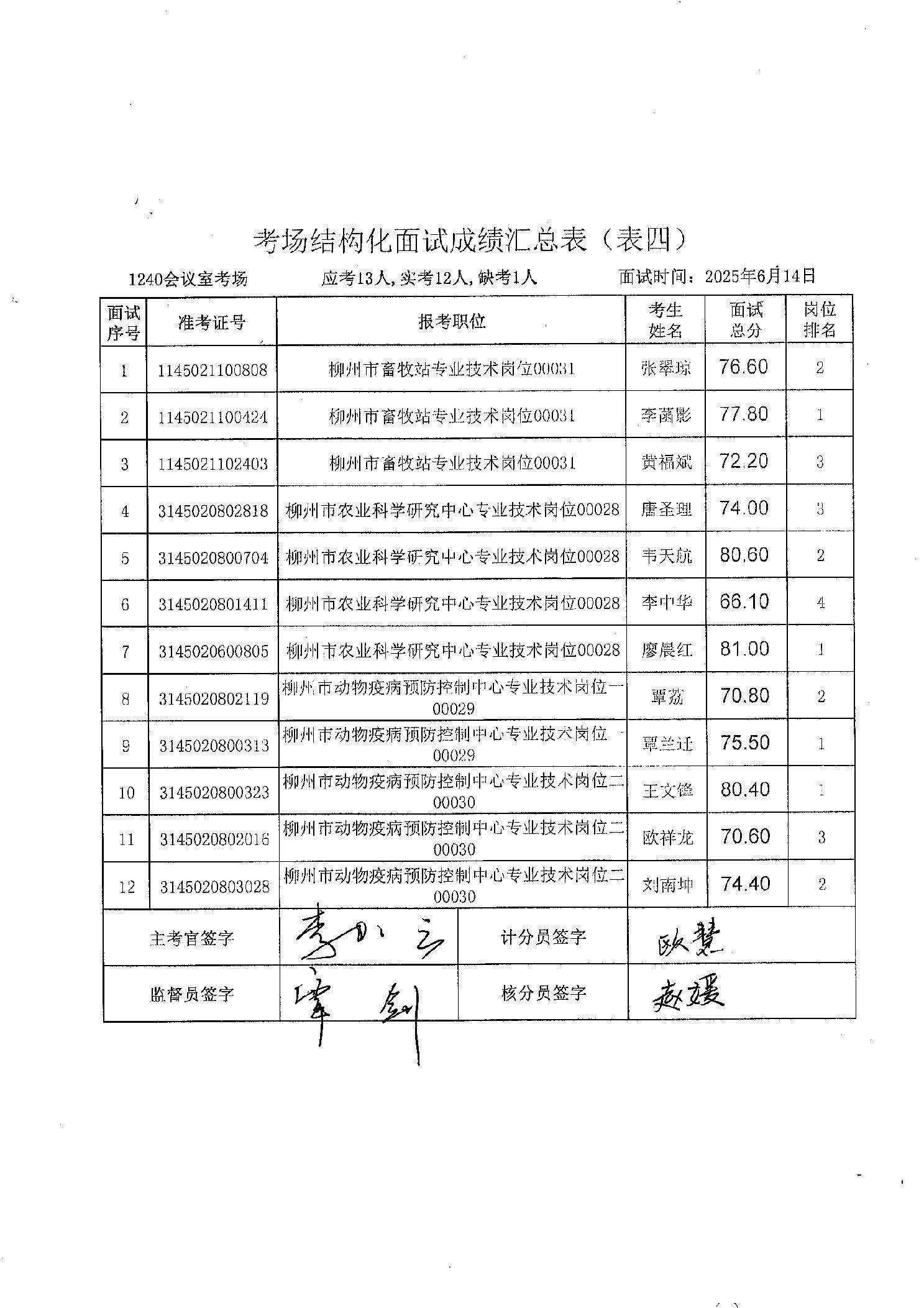 柳州市農(nóng)業(yè)農(nóng)村局2025年度上半年事業(yè)單位公開招聘面試成績
