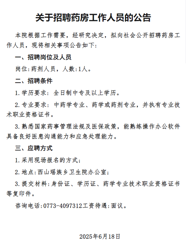 2025年灌陽縣西山瑤族鄉(xiāng)衛(wèi)生院招聘藥房工作人員1人