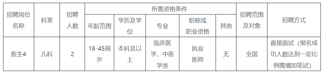 根據(jù)醫(yī)院發(fā)展需要,我院決定面向社會招聘兒科醫(yī)師2名,現(xiàn)將有關(guān)事項(xiàng)公告如下:
