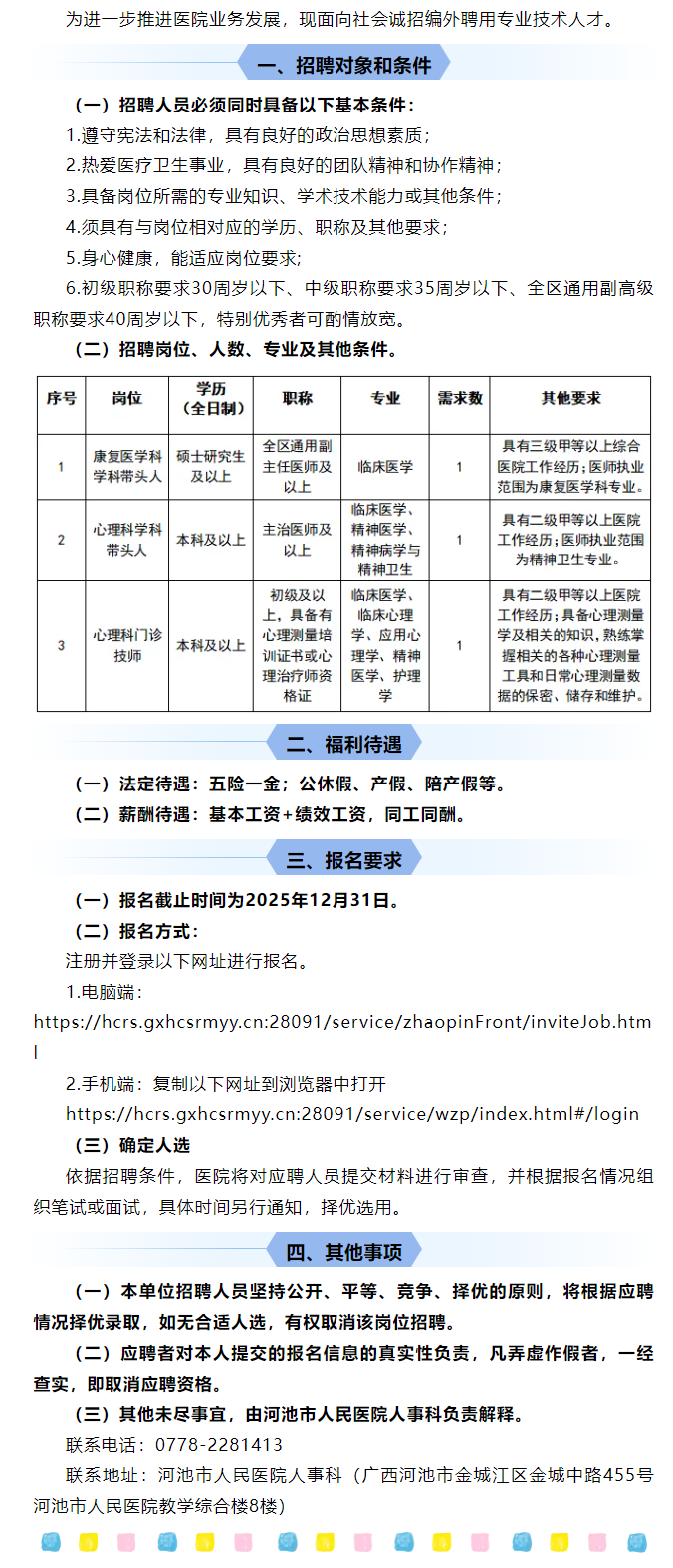 2025年河池市人民醫(yī)院公開招聘康復(fù)醫(yī)學科、心理科專業(yè)技術(shù)人才