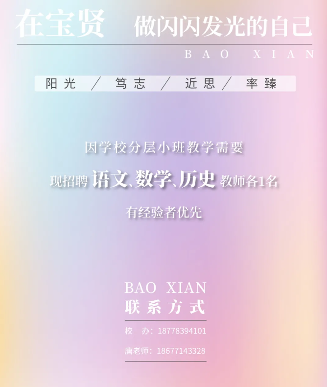 4.取得初級(jí)中學(xué)以上教師資格證,具有良好的身體和心理素質(zhì),體檢符合教師資格認(rèn)定標(biāo)準(zhǔn),對(duì)教育有理想追求,理解并愿意踐行桂林市疊彩區(qū)寶賢學(xué)校辦學(xué)理念。