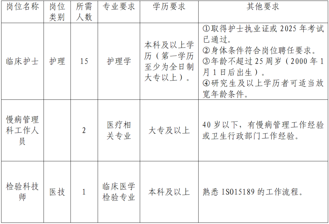 (一)報名。應聘者需在2025年9月21日前將個人電子簡歷及應聘所需佐證材料,包括但不限于畢業(yè)證(第一學歷和最高學歷)、學位證、執(zhí)業(yè)證(考試成績)、職稱證、進修結業(yè)證、??谱o士培訓合格證、執(zhí)業(yè)資格考試成績單等打包發(fā)送至rsk7836669@163.com郵箱,報名材料以“姓名+專業(yè)+衛(wèi)技招聘”名字命名。
