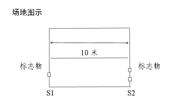 場(chǎng)地器材:場(chǎng)地為10米長(zhǎng)的直線跑道,在跑道的兩端各劃一條5cm寬直線(S1和S2),將木塊(10cm×5cm×5cm)按每道3塊豎立擺放(其中2塊放在S2線上,1塊放在S1線上),秒表若干塊。