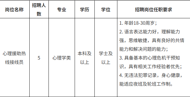 醫(yī)院承接“12356全國統(tǒng)一心理援助熱線”,提供24小時不間斷服務(wù)模式,由專職心理咨詢師、心理治療師及精神科醫(yī)護(hù)人員組成專業(yè)團(tuán)隊,為來電者提供心理教育、心理咨詢、危機(jī)干預(yù)及心理健康科普服務(wù),覆蓋情緒舒緩、家庭關(guān)系、青少年心理咨詢等多類問題,為自殺高危人群提供快速響應(yīng)與轉(zhuǎn)介服務(wù)。為進(jìn)一步提升心理服務(wù)質(zhì)量、補充現(xiàn)有接線員力量,為公眾提供更優(yōu)質(zhì)、專業(yè)、高效的心理健康服務(wù),現(xiàn)面向社會招聘5名接線員。