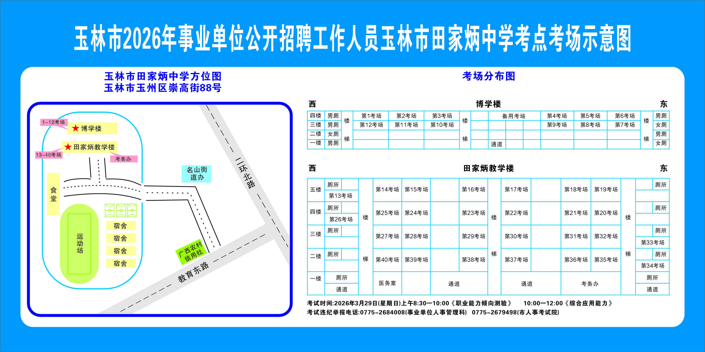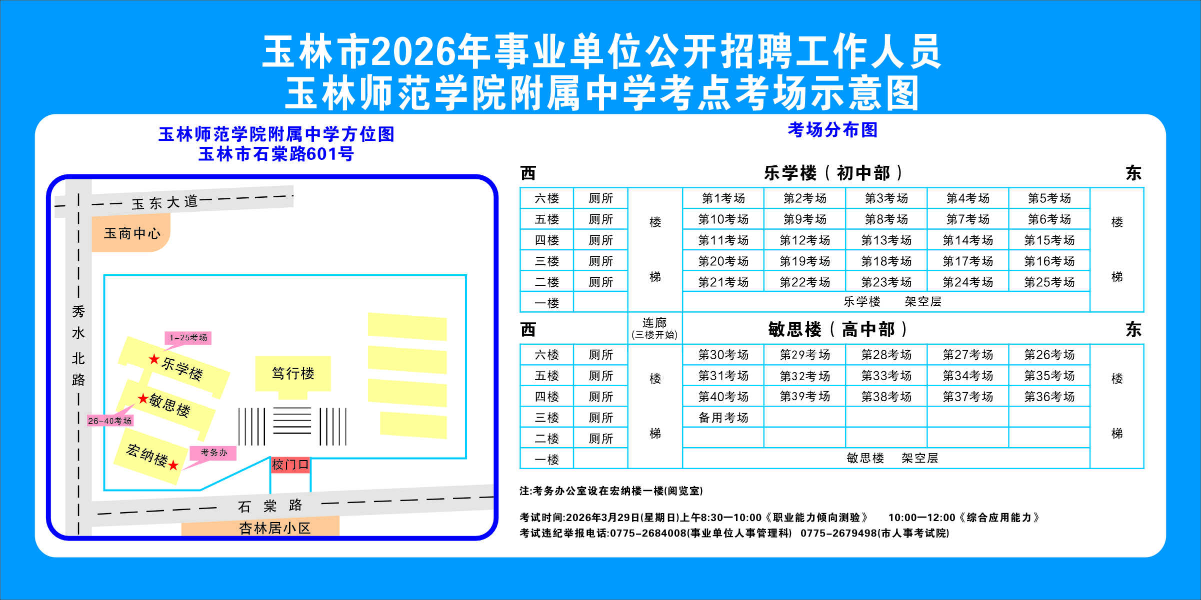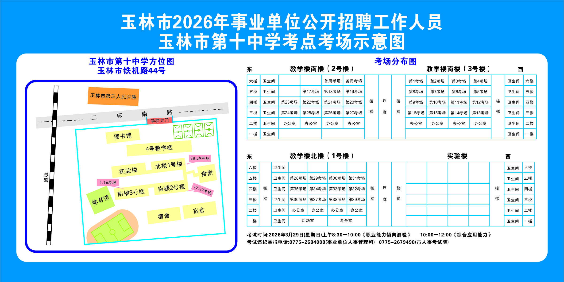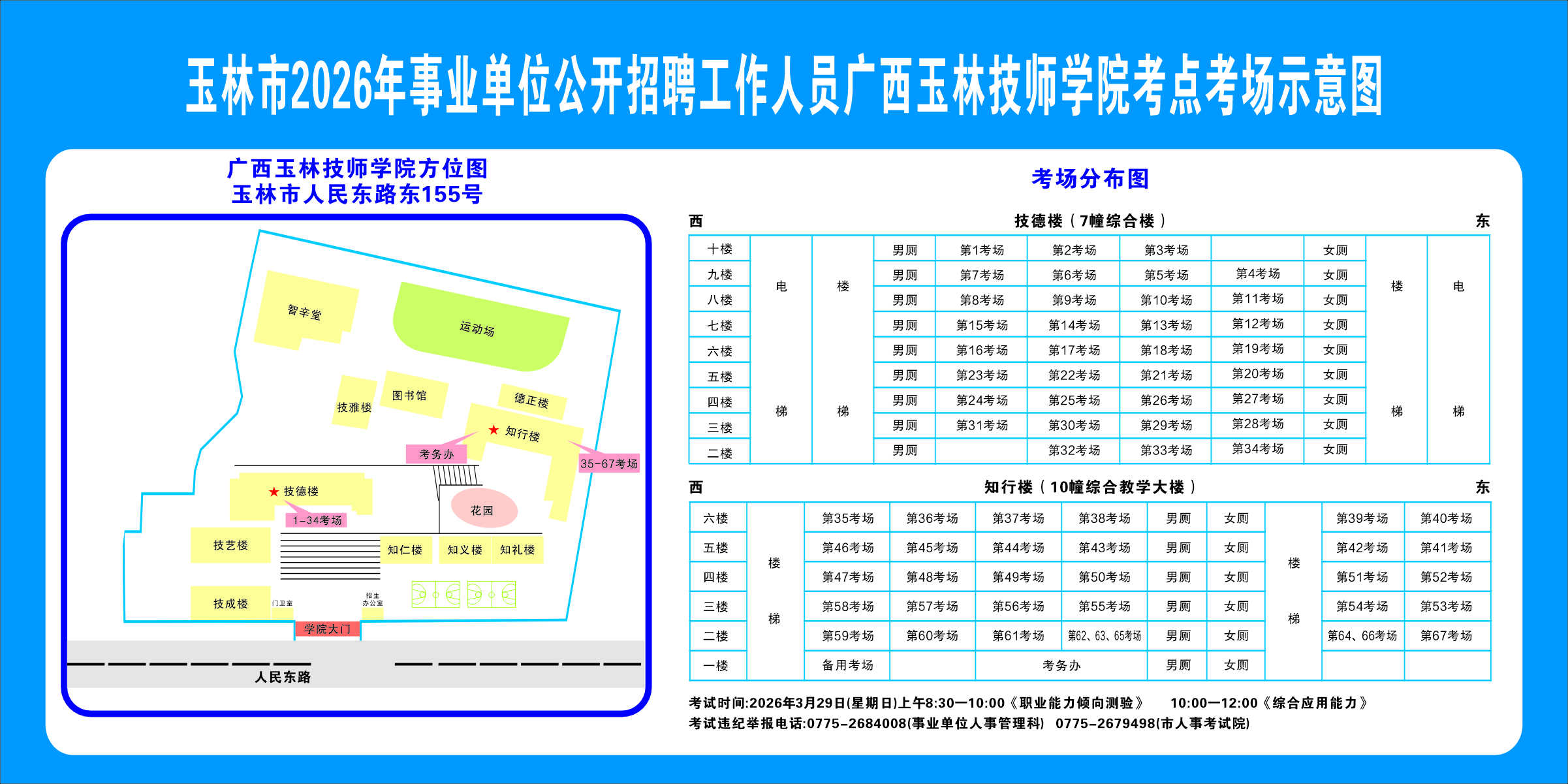 2.需要特別注意的是:玉林市第一職業(yè)中等專業(yè)學(xué)??键c是設(shè)在該校的東校區(qū)(人民東路東235號);玉林市第一中學(xué)考點分為運嶺路校區(qū)(二環(huán)北路1228號)、大北路校區(qū)(大北路453號)。